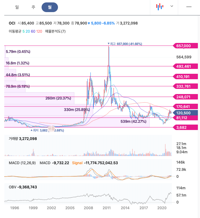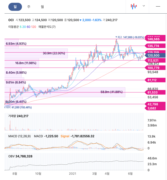 OCI는 20년 12월부터 주가가 급등하여 지속적으로 우상향하였고, 21년 4월 최고 147,000원을찍고 조정을 받은 후 보합상태에 있습니다.