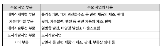 연결회사는 1959년 지배회사의 설립 이래, 고부가가치 화학제품을 생산해온 업체로, 화학산업에서 얻은 기술력, 공정 노하우, 효율적인 제조능력 등을 활용하여 고성장ㆍ고수익이 기대되는 사업들을 발굴해왔습니다. 연결회사는 군산, 포항, 광양, 익산, 천안 등 국내 각지와 미국, 중국, 말레이시아 등 해외에 생산시설을 보유하고 있으며, 생산한 제품들은 태양광 발전과 같은 신재생에너지산업에서부터 반도체, TFT-LCD와 같은 첨단 기술 산업, 그리고 자동차, 소비재 등과 같은 산업에 이르기까지 다양한 산업군에서 활용되고 있습니다. 연결회사의 사업은 베이직케미컬 사업 부문, 카본케미컬 사업 부문, 에너지솔루션 사업 부문, 도시개발사업 부문, 기타 사업 부문으로 구성되어 있으며, 사업 부문별 주요 사업의 내용은 아래와 같습니다.