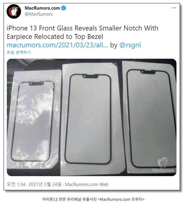 유출된 아이폰13의 전면 유리 패널 사진을 보면 상단의 스피커 부분이 베벨의 끝쪽으로 위치가 더욱 올라갔음을 알 수 있습니다. 즉, 노치가 더 작아진다는 겁니다.
