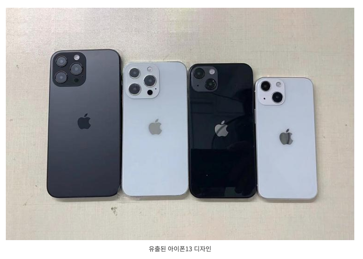 아래 하단의 사진을 보았을 때, 왼쪽부터 차례대로 아이폰 13 프로맥스, 아이폰 13프로, 아이폰 13, 아이폰 13미니입니다.