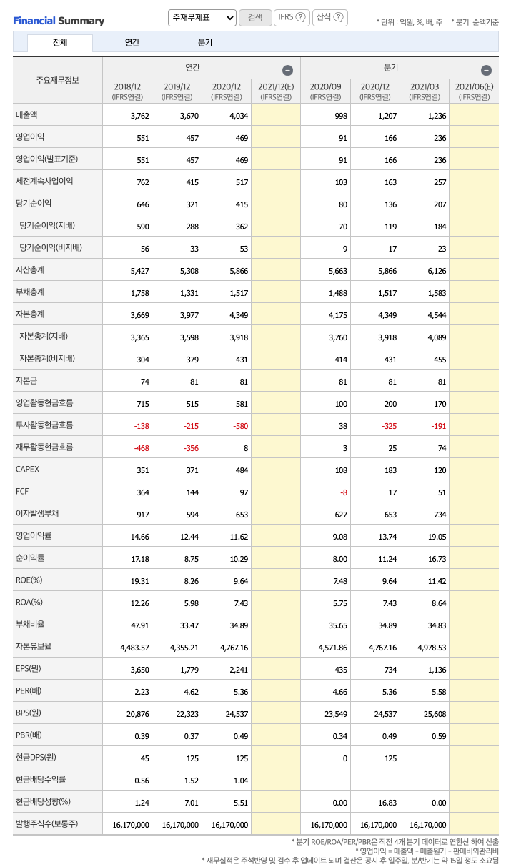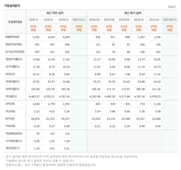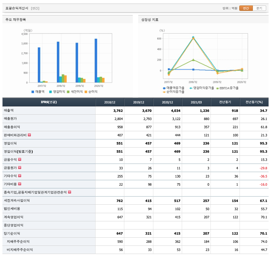 매출액 : 2018년 3762억원, 2019년 3670억원, 2020년 4034억원으로 증가, 2021년 1분기 1236억원으로 전년동기대비 증가하였습니다. 2021년 1분기는 전년동기대비 34.7% 증가하였습니다. 2020년 분기별로 보면 2분기 911억원, 3분기 998억원, 4분기 1207억원입니다.