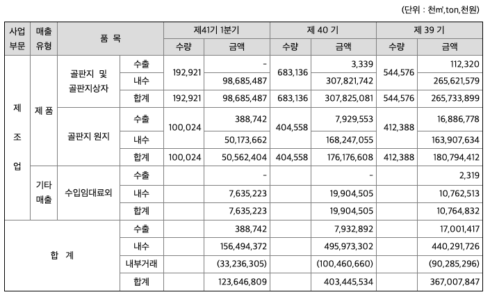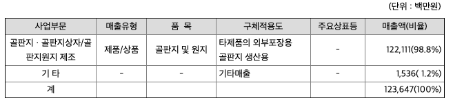 연결회사는 공산품, 식품, 의약품 및 농ㆍ수산물 등 각종 제품의 외부포장에 사용되는 골판지 및 골판지상자를 100% 주문생산, 판매하고 있고, 골판지 제조에 사용되는골판지용 라이너 및 골심지를 생산하고 있습니다. 각 제품별 매출액 및 총 매출액에서 차지하는 비율은 다음과 같습니다.