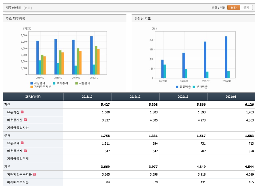 자산은 2018년 5427억원, 2019년 5308억원으로 감소, 2020년 5866억원으로 증가, 2021년 1분기 6126억원으로 증가 하였습니다.