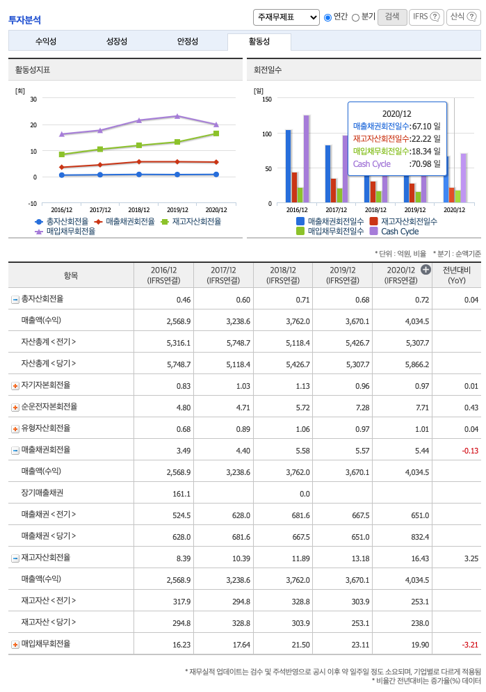 재고자산회전율 : 2018년 약 303억원, 2019년 약 253억원, 2020년 약 238억원이고, 회전율은 2018년 약 11%, 2019년 약 13%, 2020년 약 16%로 안정적입니다.