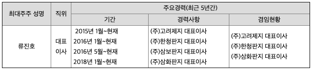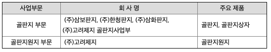 2005년 1월에 골판지원지 생산업체인 (주)고려제지 지분을 인수, 계열회사로 편입하여 원재료의 안정적인 수급을 확보할 수 있게 되었습니다. 골판지원지는 골을 만들어 완충역할을 하는 골심지와 골심지의 표면에 접합하여 인쇄를 하는 표면지와 안쪽의 이면지로 구분되는데, 당사는 표면지를 주축으로 하여 전지종의 골판지원지를 생산, 판매함으로써 경쟁력 있는 기업으로의 성장을 도모하고 있습니다. 골판지원지의 생산원료로는 펄프와 고지가 있으며, 펄프와 수입고지는 국제경기 및 환율변동이 가격에 큰 영향을 미치며, 국내고지는 골판지업계의 수요 증감및 수출 물량의 증감으로인한 수급 상황에 따른 가격 변동성에 영향을 받고 있습니다. 2013년 11월에는 소각로용 보일러 가동의 원료로 사용되는 고형연료와 고지의 원활한 수급을 위하여 (주)현대자원 지분을 인수하였습니다.