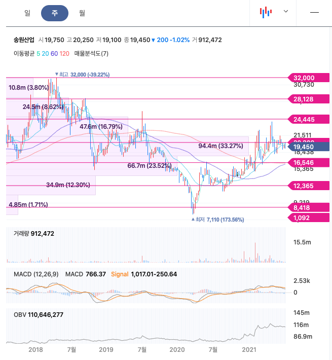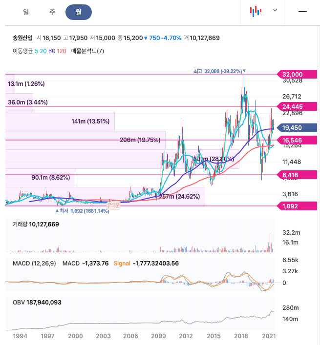 송원산업은 20년 8월부터 주가가 반등하여 주속적으로 우상향하였고, 21년 4월에 최고 24,000원을 찍고 조정을 받았습니다.