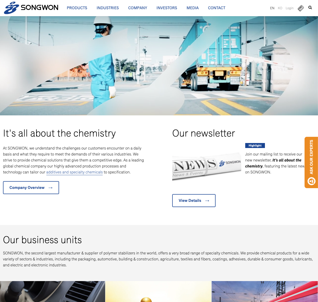 Our business units SONGWON, the second largest manufacturer & supplier of polymer stabilizers in the world, offers a very broad range of specialty chemicals. We provide chemical products for a wide variety of sectors & industries, including the packaging,