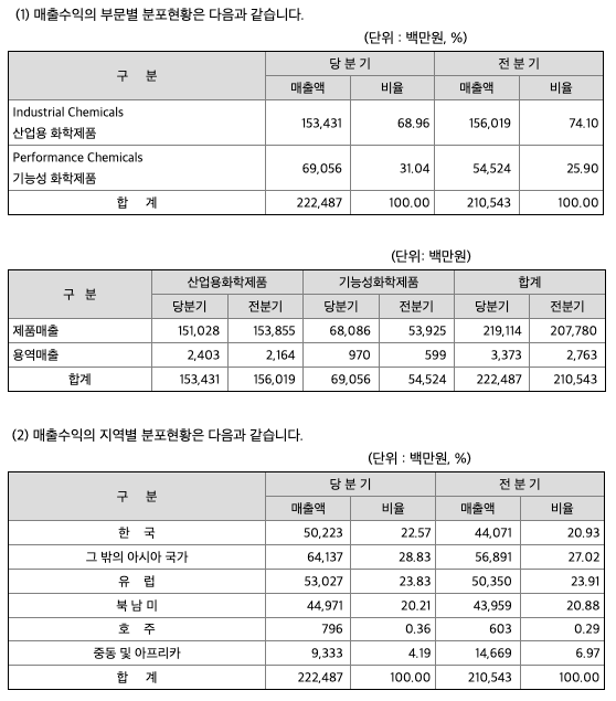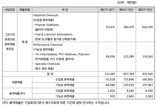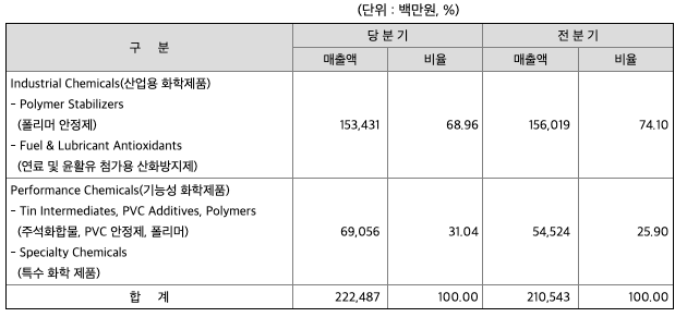 회사는 산업용 화학제품 부문의 폴리머 안정제(Polymer Stabilizers), 연료 및 윤활유 첨가용 산화방지제(Fuel & Lubricant Antioxidants)와 기능성 화학제품 부문의 주석 중간체(Tin Intermediates), PVC 안정제(PVC Additives), 폴리머(Polymers), 특수화학 제품(Specialty Chemicals) 등을 생산, 판매하고 있습니다.