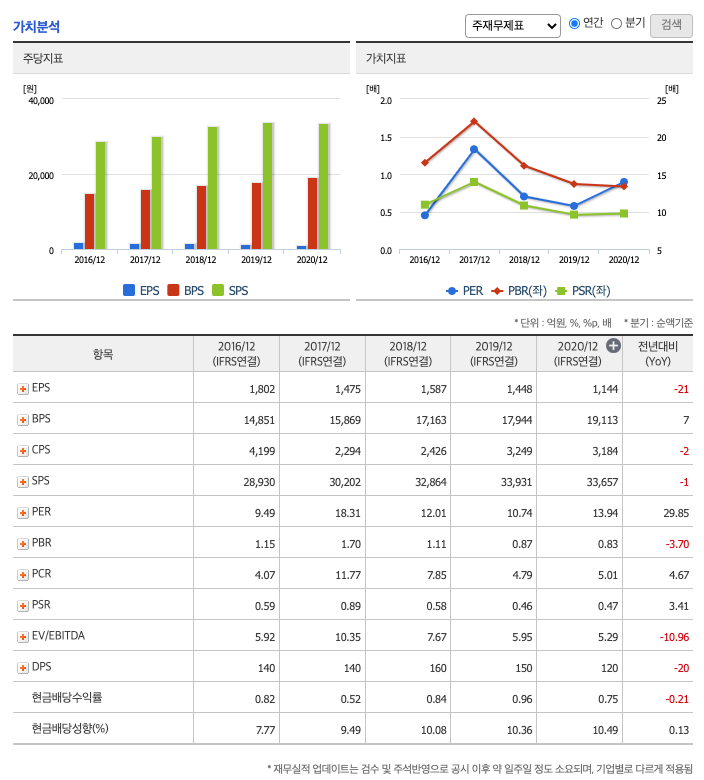 DPS(Dividend Per Share의 약자, 총배당금을 총주식발생수로 나눈 것, 한 주당 얼만큼의 배당금을 받을 수 있는지 알 수 있는 지표, DPS가 높을 수록 배당금이 많은 것임) : 2016년 140원, 2017년 140원, 2018년 160원, 2019년 150원, 2020년 120원입니다.