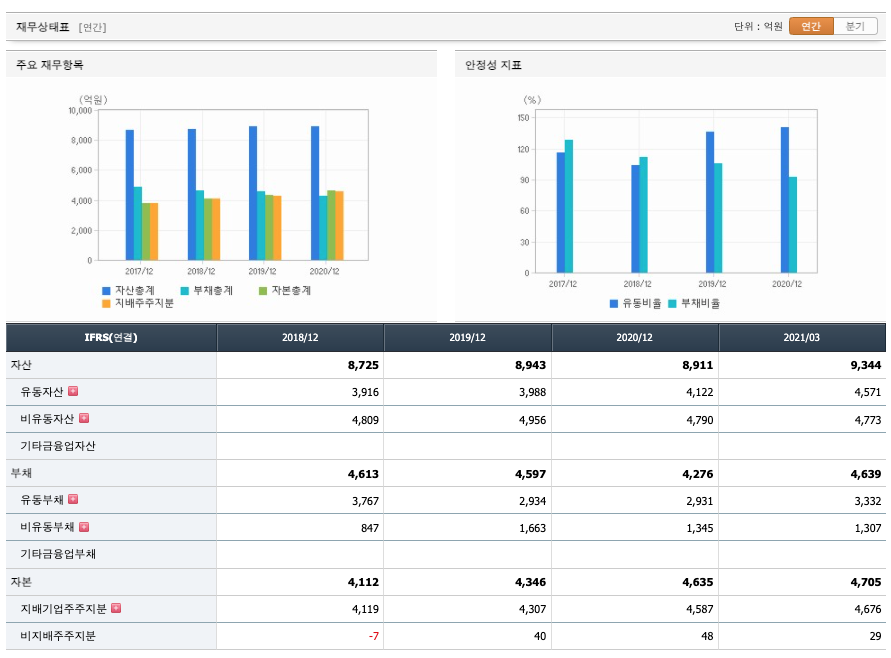 부채는 2018년 4613억원, 2019년 4597억원으로 감소, 2020년 4276억원으로 감소, 2021년 1분기 4639억원으로 증가 하였습니다.