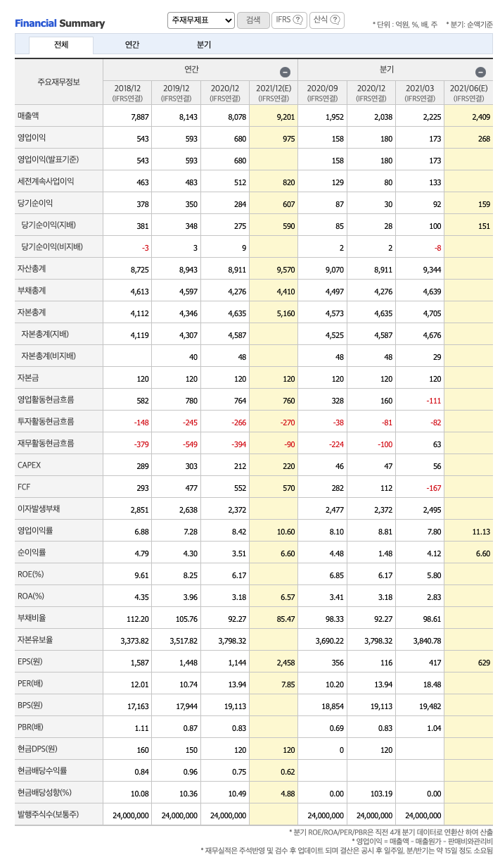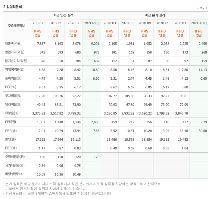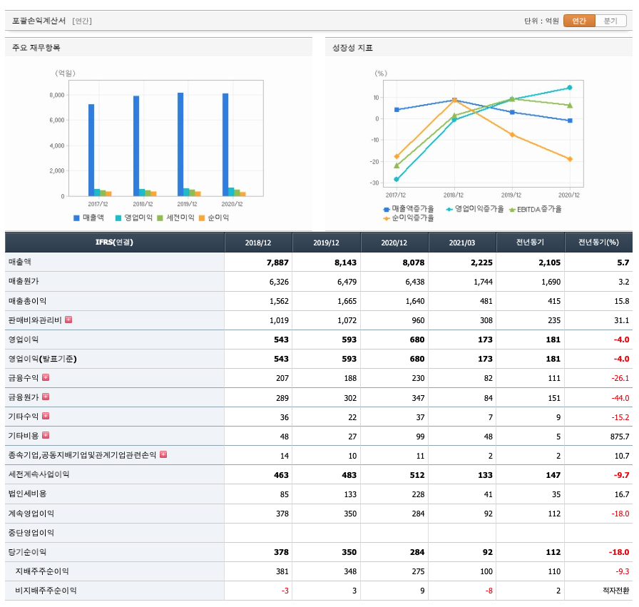 매출액 : 2018년 7887억원, 2019년 8143억원으로 증가, 2020년 8078억원으로 감소, 2021년 1분기 2225억원으로 전년동기대비 증가하였습니다. 2021년 1분기는 전년동기대비 5.7% 증가하였습니다. 2020년 분기별로 보면 2분기 1981억원, 3분기 1952억원, 4분기 2038억원입니다.