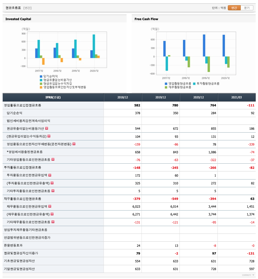 영업활동 현금흐름 : 2018년 582억원, 2019년 780억원, 2020년 764억원, 2021년 1분기 -111억원으로 2021년 1분기 영업활동 현금흐름은 원활하지 않습니다.