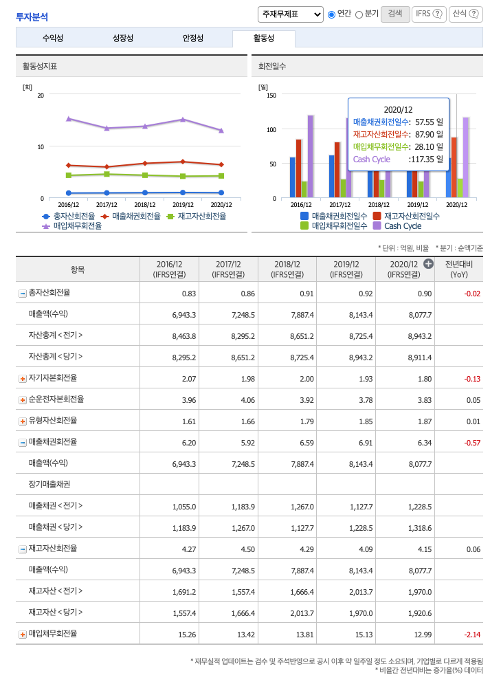**매출채권회전일수(=돈을 받는 순환일 수, 낮을 수록 좋습니다) 약 57일, 재고자산회전일수(=재고자산 빠지는 일수, 낮을 수록 좋습니다) 약 87일, 매일채무회전일수(=돈을 늦게 줘도 되는 일 수, 높을 수록 좋습니다) 약 28일이고, Cash Cycle(현금회전율, 낮을 수록 좋습니다) 약 117일로 현금운영이 불안정적입니다.