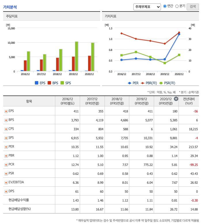DPS(Dividend Per Share의 약자, 총배당금을 총주식발생수로 나눈 것, 한 주당 얼만큼의 배당금을 받을 수 있는지 알 수 있는 지표, DPS가 높을 수록 배당금이 많은 것임) : 2016년 61원, 2017년 60원, 2018년 50원, 2019년 50원, 2020년 50원으로 하였습니다.