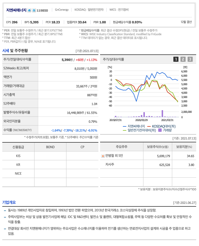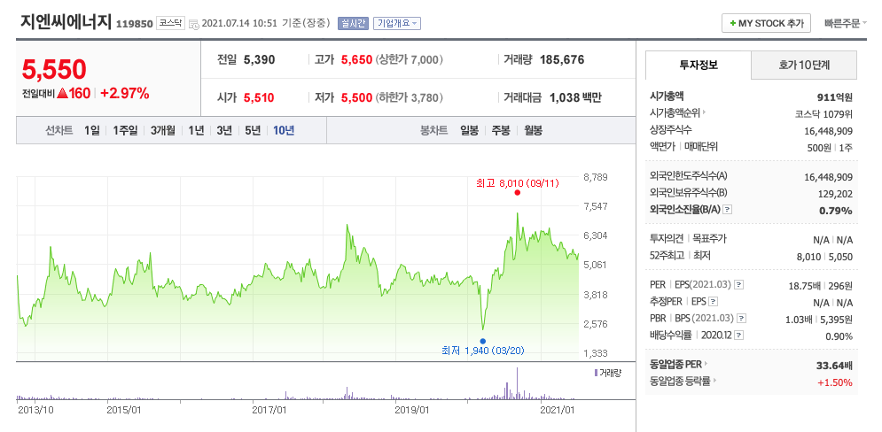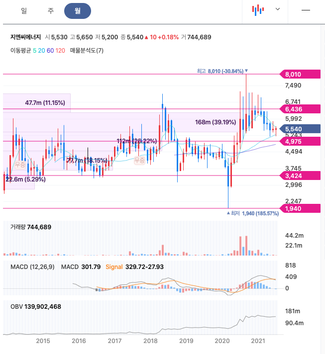 지엔씨에너지는 20년 4월부터 주가가 올라 20년 9월에 최고 8,010원을 찍고 조정을 받고 횡보중에 있습니다.
