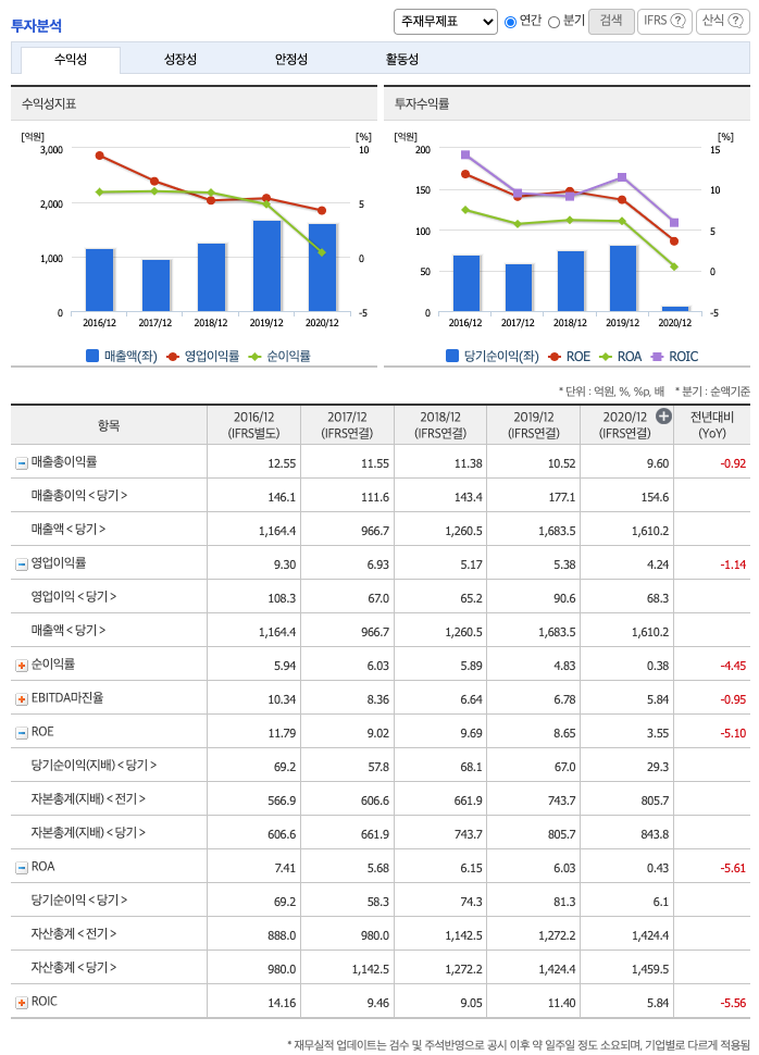 ROE(Return On Equity, 자기자본순이익율, 주주의 관점) : 2016년 약 11%, 2017년 약 9%, 2018년 약 9%, 2019년 약 8%, 2020년 약 3%이고, 자기자본순이익율은 이상율(10%)보다 낮습니다.