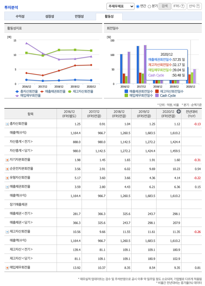 매출채권회전율 : 2018년 약 243억원, 2019년 약 298억원, 2020년 약 207억원이고, 회전율은 2018년 약 4%, 2019년 약 6%, 2020년 약 6%로 안정적입니다.