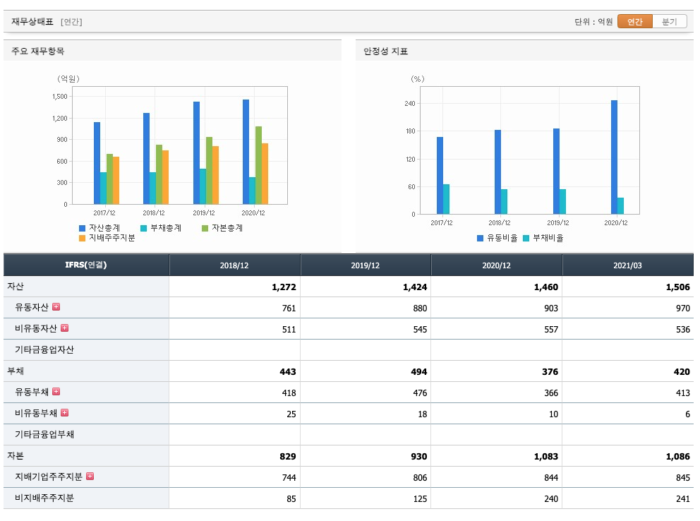 자본은 2018년 829억원, 2019년 930억원, 2020년 1083억원으로 증가, 2021년 1분기 1086억원으로 증가 하였습니다.