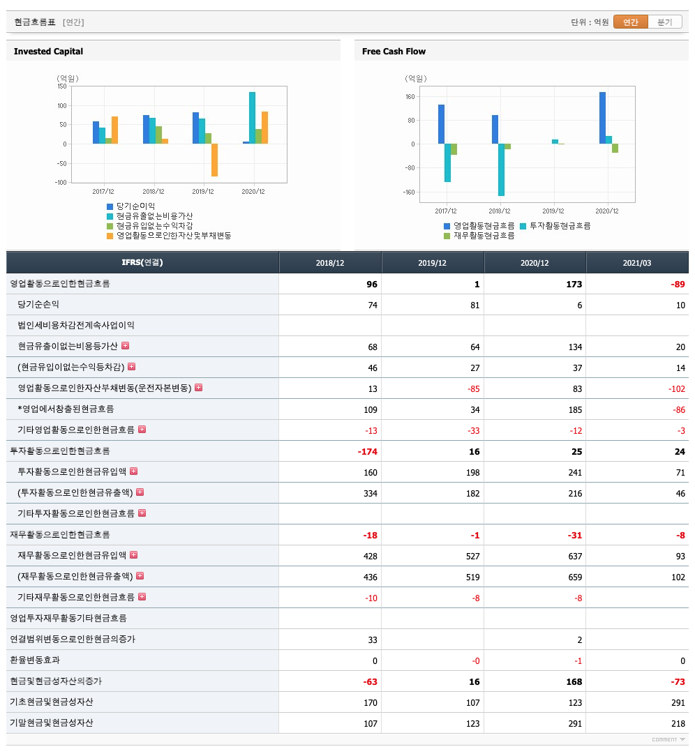 투자활동 현금흐름 : 2018년 -174억원, 2019년 16억원, 2020년 25억원, 2021년 1분기 24억원으로 2019년부터 투자활동 현금흐름이 원활하지 않습니다.