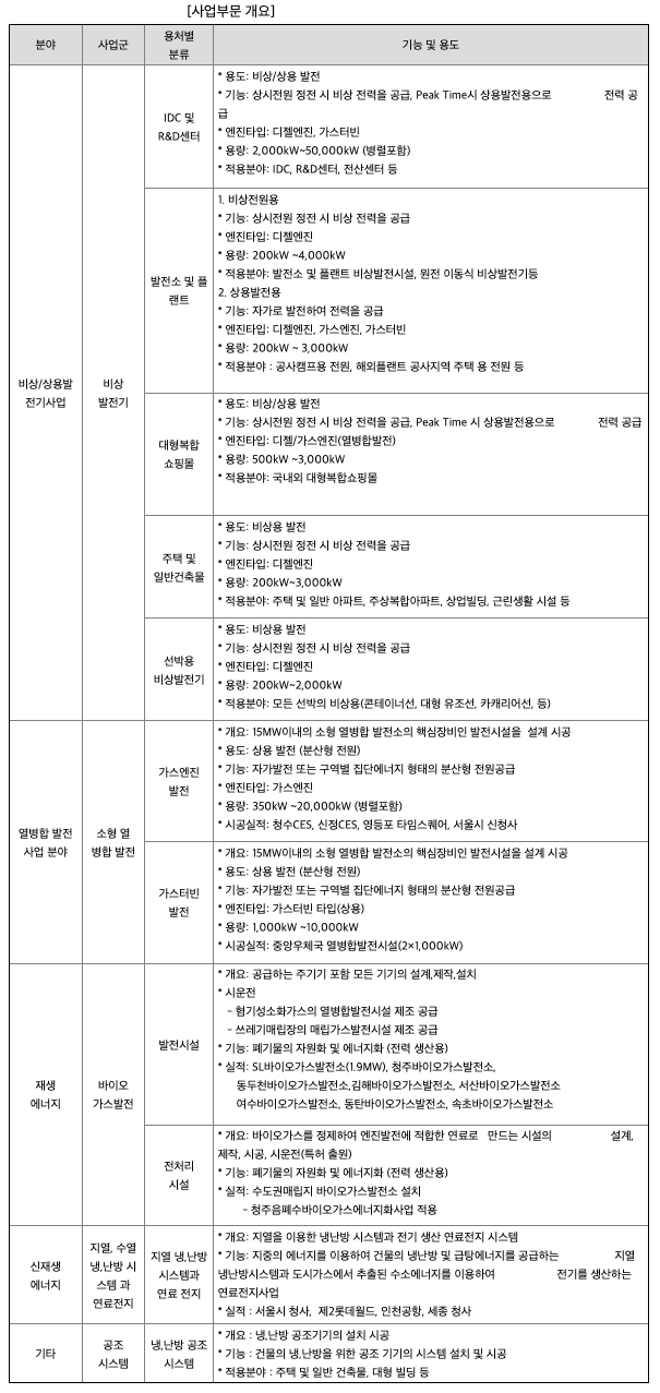(주)지엔씨에너지의 사업부문은 비상 및 상용 발전기사업, 바이오가스발전사업이며, 종속기업인 지엔원에너지(주)와 한빛에너지의 사업부문은 신재생 에너지인 지열 냉난방시스템 사업과 연료전지 사업, 냉난방 공조시스템 사업으로 구성되어 있습니다. 현재 (주)지엔씨에너지의 주력사업부는 비상 및 상용 발전기사업에 해당하며, 지속적인 기술연구와 개발을 통한 경쟁력 있는 기술적 우위를 바탕으로 IDC(인터넷데이터센터) 및 R&D센터, 발전소 및 플랜트, 대형복합쇼핑몰, 주택 및 일반건축물 등 다양한 수요처를 확보하고 안정적인 수익을 창출하고 있습니다. 당사는 비상용 발전기사업에서 쌓은 Know-How를 바탕으로 상용 발전인 열병합 발전사업에 진출하였으며, 해당 사업 분야는 가스엔진발전, 가스터빈발전, 플랜트 공사로 세분할수 있으며, 각 세부분야별로 시공실적이 누적되면서 당사만의 기술을 축적하고 있습니다. 그리고 높은 기술력을 필요로 하는 선박용 비상발전기 시장과 발전용 스팀터빈의 설치와 시공에도 진출하여 실적을 쌓아 가고 있습니다. 당사가 미래의 수익창출을 위한 신성장 동력으로 육성하고 있는 바이오가스발전 사업은 미래 지향적인 재생에너지 사업으로 국산화 연구와 실증사업을 완료 후 상업운전에 돌입하였으며, 환경부로부터 녹색기술인증 및 녹색사업인증을 획득했고 타사와 비교하여 뛰어난 기술 경쟁력을 보유하고 있습니다. 최근에는 세계적인 환경 설비 업체와 손잡고 새로운공법을 국내에 소개하고 시장 확대를 위해 노력하고 있으며, 에너지저장장치(ESS)와 선박용 비상 발전기 사업, 스팀터빈, 연료 전지 사업에 꾸준히 참여 하고 있습니다. 종속회사인 지엔원에너지(주)와 한빛에너지는 친환경 신재생 에너지 전문 기업으로써 탈원전 신재생 에너지 활용 시대에 부응하기 위해 지중의 에너지를 이용하여 건물의 냉난방 및 급탕에너지를 공급하는 지열과 수열 냉난방시스템과 냉, 난방 공조 시스템 그리고 연료전지사업의 설계 및 시공을 주 사업으로 진행하고 있고 지열, 수열 냉난방시스템과 연료 전지사업의 신재생 에너지 기술 개발을 통한 적극적인 시장 확대를 모색하고 있습니다.
