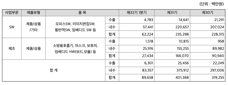 당사의 매출 중 S/W사업부문의 매출은 한컴오피스 및 이지포토를 중심으로 한 사무용 패키지 소프트웨어 제품 매출이 대부분을 차지하며, 모바일 및 웹 오피스, 통번역서비스, 임베디드 솔루션 등의 매출을 포함합니다. 제조부문의 매출액은 소방용 호흡기 및 마스크, 보호의 등의 매출이 포함됩니다. 당사 매출의 세부내역은 다음과 같습니다.