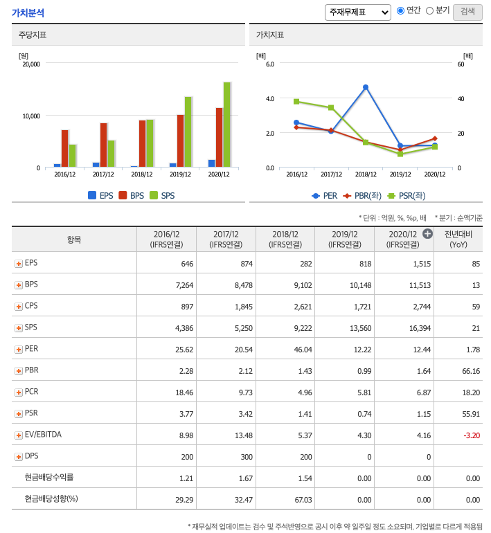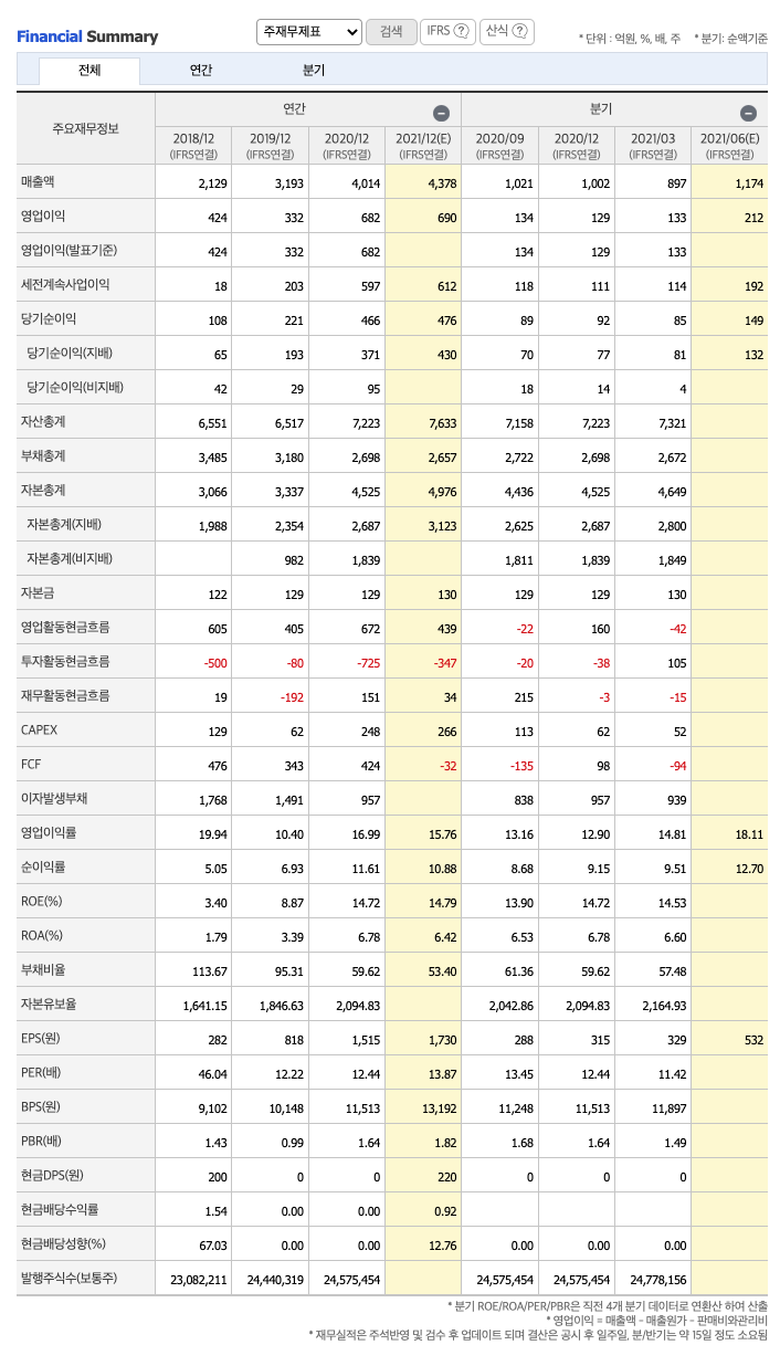 FCF(미래현금흐름) : 2018년 476억원, 2019년 343억원, 2020년 424억원으로 미래현금흐름이 좋습니다. 2021년은 -32억원으로 추정됩니다.