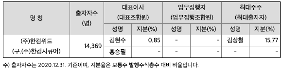 [최대주주 관련사항] 당사의 최대주주인 (주)한컴위드는 PKI 기반 Infrastructure를 포함한 보안 솔루션을 공급하는 소프트웨어 기업으로 1999년 3월 설립되었으며, 2012년 12월 당사의 최대주주가 되었습니다. 본 보고서 작성 기준일 현재 솔루션사업과 보안기술서비스사업을 영위하고 있으며, 주요 개요는 아래와 같습니다.