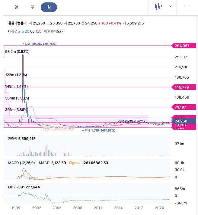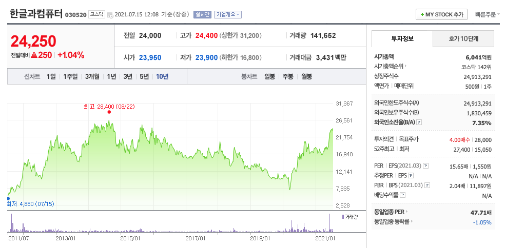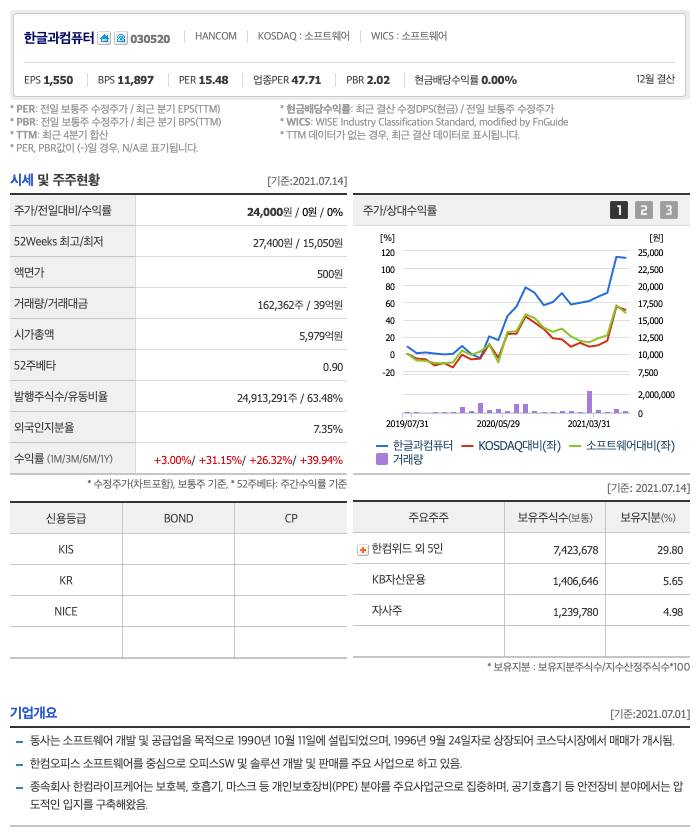 | 한글과컴퓨터 | 24,250원 | 23,216원 | 22,486원 | 22,834원 |