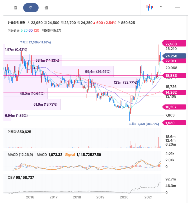 한글과컴퓨터는 20년 9월부터 횡보하다가 21년 6월에 급등하였고 최고 27,400원을 찍고 조정을 받은 뒤, 횡보중입니다.
