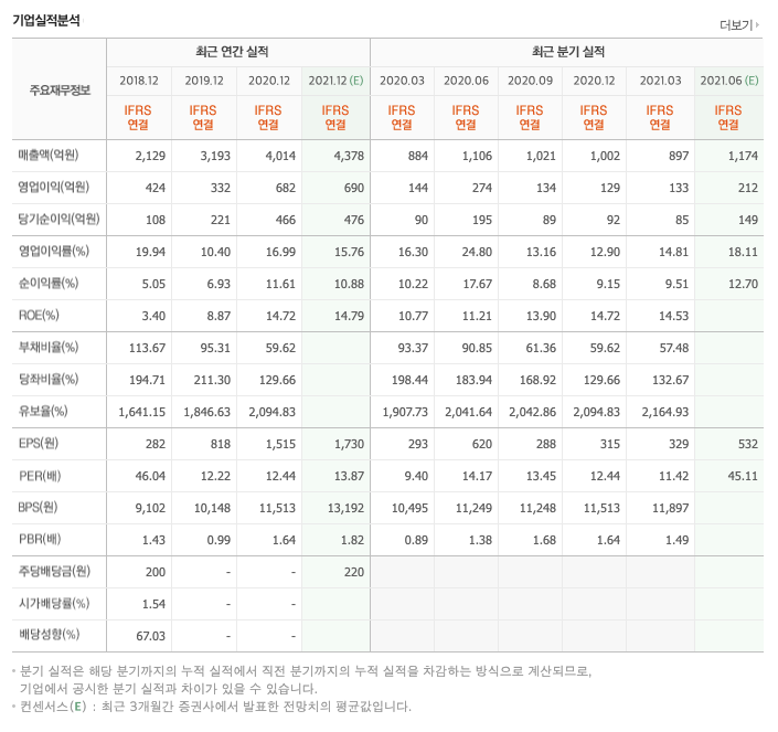 영업이익 : 2018년 424억원, 2019년 332억원, 2020년 682억원, 2020년 1분기 133억원으로 전년동기대비 감소하였습니다. 2021년 1분기는 전년동기대비 -7.9% 감소하였습니다. 2020년 분기별로 보면 2분기 274억원, 3분기 134억원, 4분기 129억원입니다.