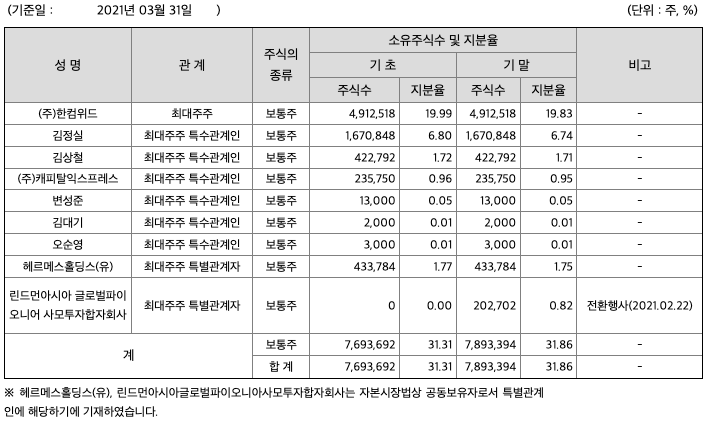 당사의 최대주주는 (주)한컴위드입니다. 보고서 작성 기준일 현재 당사 주식을 4,912,518주(19.83%) 보유하고 있으며, 특수관계인을 포함하여 7,893,394주(31.86%)를 보유하고 있습니다.