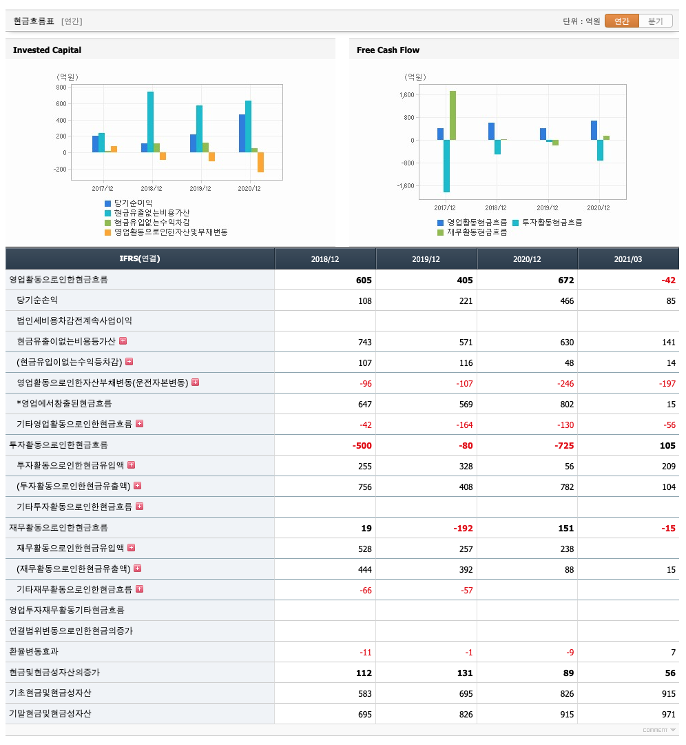 투자활동 현금흐름 : 2018년 -500억원, 2019년 -80억원, 2020년 -725억원, 2021년 1분기 105억원으로 2020년까지 투자활동 현금흐름이 원활합니다.