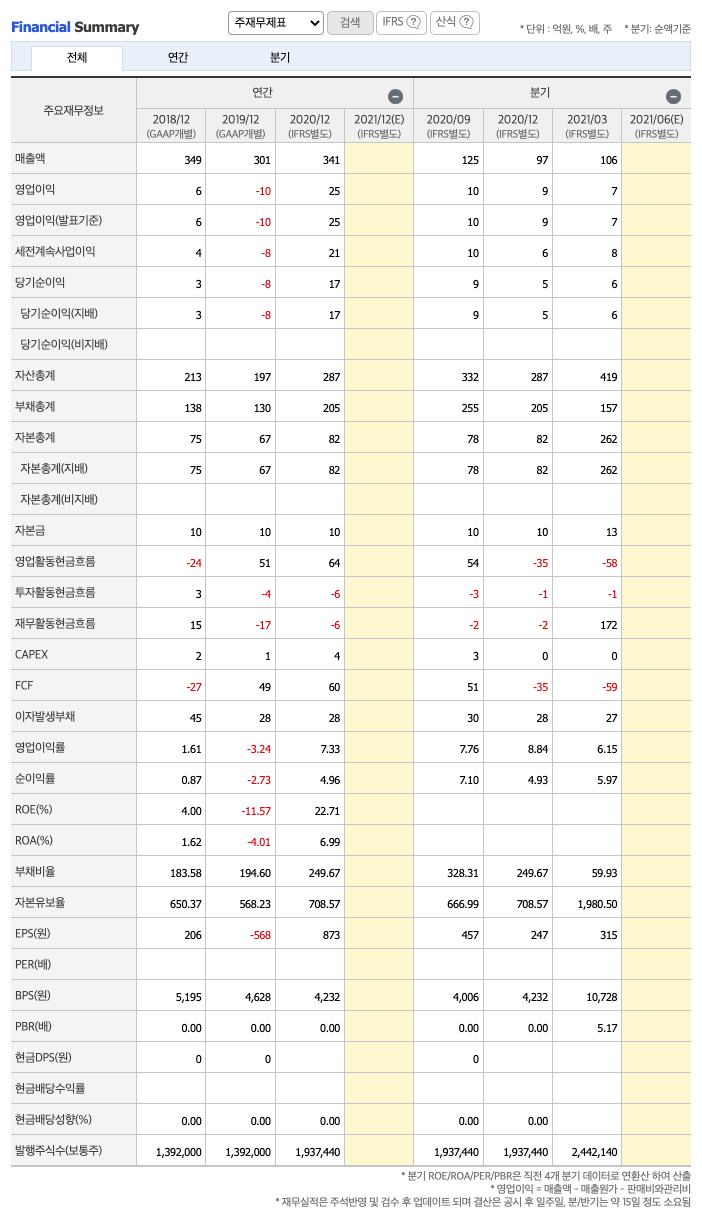 매출액 : 2018년 349억원, 2019년 329억원으로 감소, 2020년 341억원으로 증가, 2021년 1분기 106억원으로 전년동기대비 증가하였습니다. 2021년 1분기는 전년동기대비 69.1% 증가하였습니다. 2020년 분기별로 보면 2분기 56억원, 3분기 125억원, 4분기 97억원입니다.