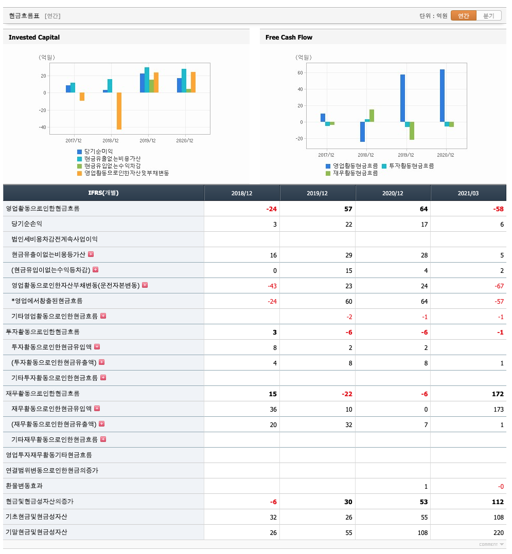 영업활동 현금흐름 : 2018년 -24억원, 2019년 57억원, 2020년 64억원, 2021년 1분기 -58억원으로 2018년과 2021년 1분기의 영업활동 현금흐름은 원활하지 않고, 2019년과 2020년의 영업활동 현금흐름은 원활합니다.
