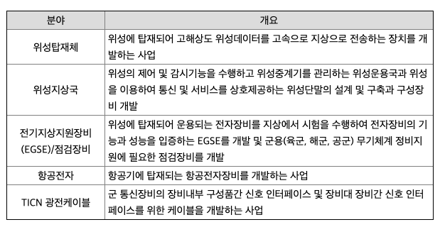 당사는 위성통신부품 제조를 목적으로 설립되어 위성탑재체, 위성운용국 및 단말, 전기지상지원장비(EGSE(Electrical Ground Support Equipment)) 사업을 주력으로 영위하고 있으며, 주요 고객은 한국항공우주연구원(KARI), AIRBUS D&F로 위성탑재용 주파수 X대역(8.025~8.4GHz) 송신기(X-band Transmitter), ANASIS-II 위성운용국을 설계, 구축 및 제조해오고 있습니다. 또한, 당사는 군 전술정보통신체계(TICN)사업의 핵심부품인 비접촉식광전케이블, 소형무장헬기(LAH)사업 및 대한민국 차세대 전투기(KF-X)사업 등의 항공전자장비, 점검장비 등 방위사업도 영위하고 있습니다. 주요 고객은 한화시스템(주), 한국항공우주산업(주) 등입니다.