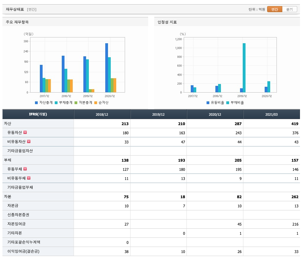 자산은 2018년 213억원, 2019년 210억원으로 감소, 2020년 287억원으로 증가, 2021년 1분기 419억원으로 증가하였습니다.