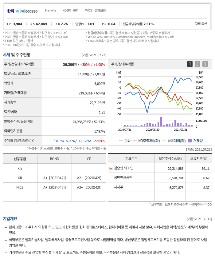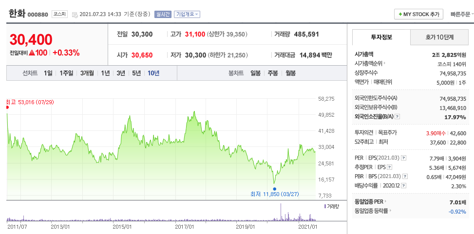 한화의 2021년 영업이익은 23,372억원으로 추정됩니다. 현재(21. 7. 23) 시가총액은 억원으로 멀티플 1입니다.