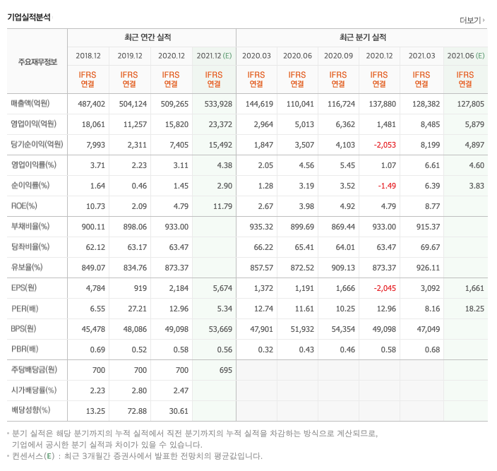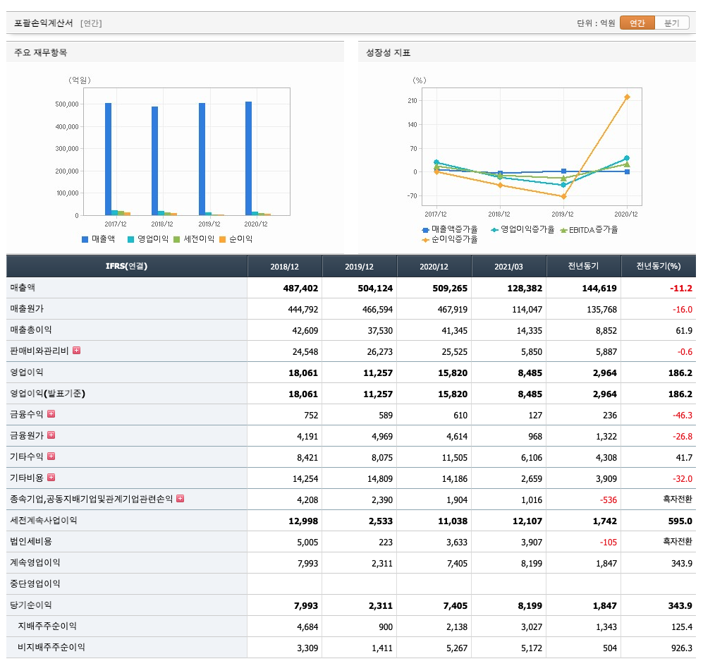 매출액 : 2018년 487,402억원, 2019년 504,124억원, 2020년 509,265억원으로 증가, 2021년 1분기 128,382억원으로 전년동기대비 감소하였습니다. 2021년 1분기는 전년동기대비 -11.2% 감소하였습니다. 2020년 분기별로 보면 2분기 110,041억원, 3분기 116,724억원, 4분기 137,880억원입니다.