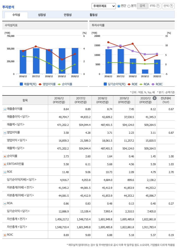 ROA(Return On Assets, 총자산순이익율, 경영자의 관점) : 2016년 약 0.86%, 2017년 약 0.83%, 2018년 약 0.48%, 2019년 약 0.13%, 2020년 약 0.4%이고, 총자산이익율은 이상율(10%)보다 낮습니다.