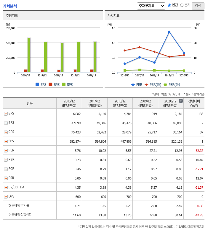 ROE(Return On Equity, 자기자본순이익율, 주주의 관점) : 2016년 약 11%, 2017년 약 9%, 2018년 약 10%, 2019년 약 2%, 2020년 약 4%이고, 자기자본순이익율은 이상율(10%)보다 낮습니다.