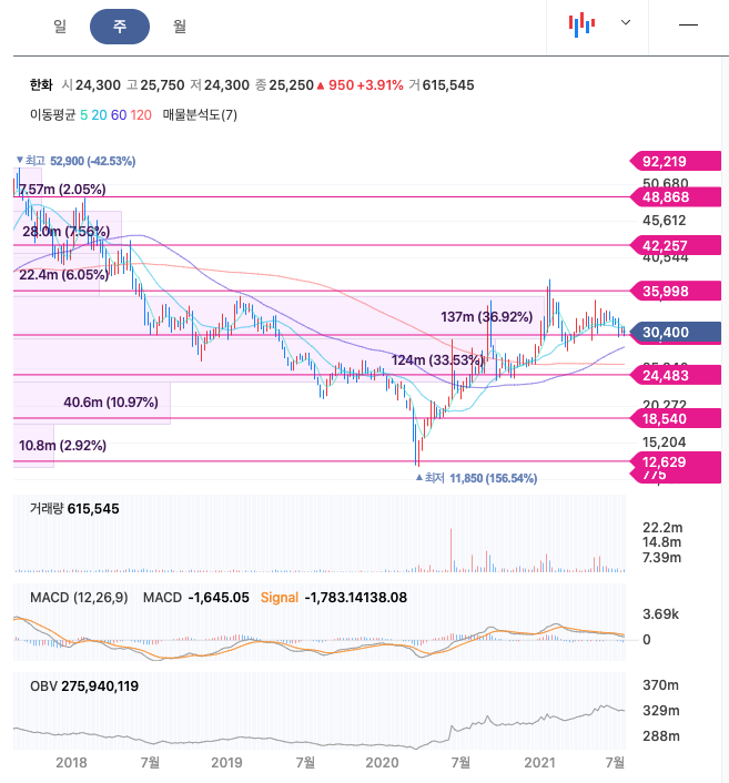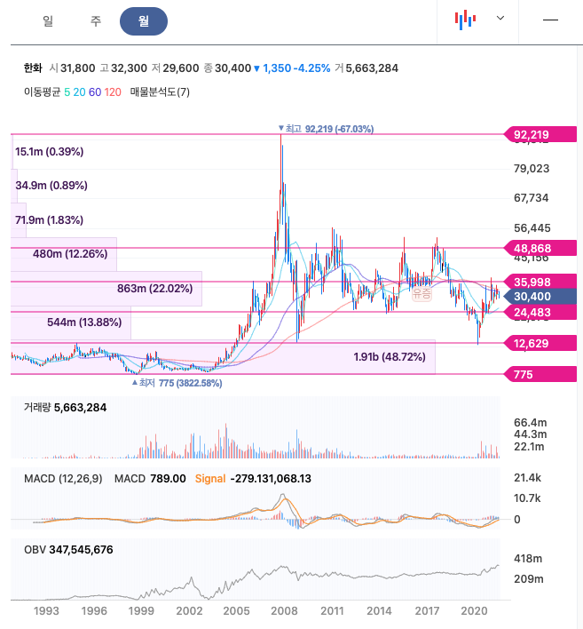 한화는 20년 12월에 주가가 다시 상승하였고, 21년 1월에 최고 37,600원을 찍고 조정을 받은 후 횡보를 하고 있습니다.