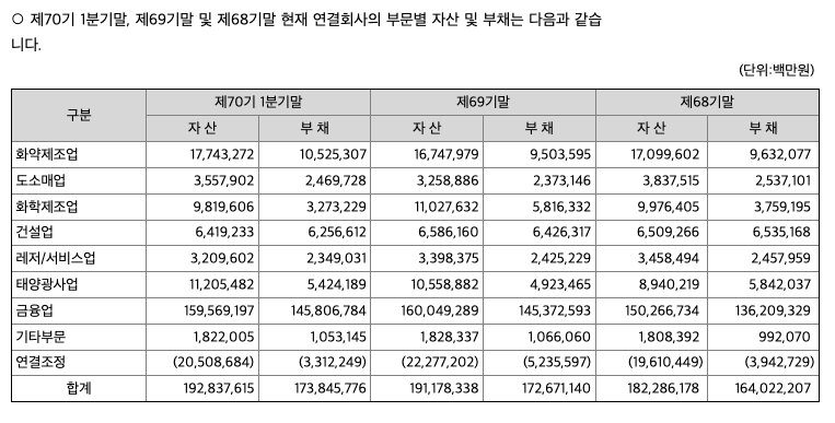 금융업 부문에서는 생명보험(한화생명보험(주) 등), 손해보험(한화손해보험(주)), 금융투자(한화투자증권(주) 등), 저축은행((주)한화저축은행), 자산운용(한화자산운용(주) 등) 사업 등을 영위하고 있습니다. 참고로, 한화생명보험(주)는 개인영업본부 산하 보험 모집 및 지원 사업부문((가칭)한화생명금융서비스 주식회사)을 물적분할했으며, 분할기일은 2021년 04월 01일입니다. 이와 관련된 상세한 사항은 2021년 4월 2일 한화생명보험(주)가 공시한 합병등종료보고서(분할)를 참고하시기 바랍니다.