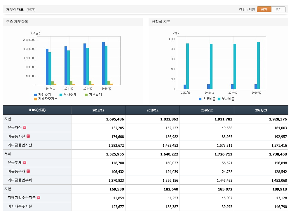 자산은 2018년 1,695,486억원, 2019년 1,822,862억원, 2020년 1,911,783억원, 2021년 1분기 1,928,376억원으로 ㅈ증가하였습니다.