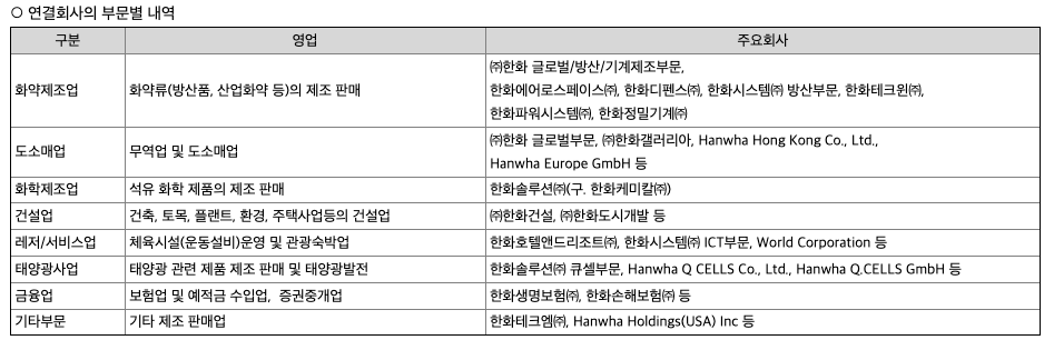 화약제조업 부문에서는 산업용 화약((주)한화 글로벌부문), 방산((주)한화 방산부문, 한화디펜스(주), 한화시스템(주)), 항공엔진(한화에어로스페이스(주)), 산업용 기계((주)한화 기계부문, 한화정밀기계(주)), 시큐리티(한화테크윈(주)), 에너지 장비(한화파워시스템(주)) 사업을 영위하고 있습니다.