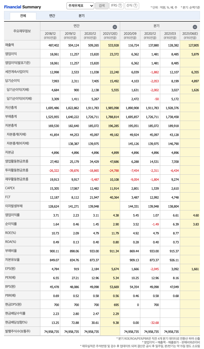 영업활동 현금흐름 : 2018년 27,492억원, 2019년 25,179억원, 2020년 34,429억원, 2021년 1분기 7358억원으로 영업활동 현금흐름이 원활합니다.
