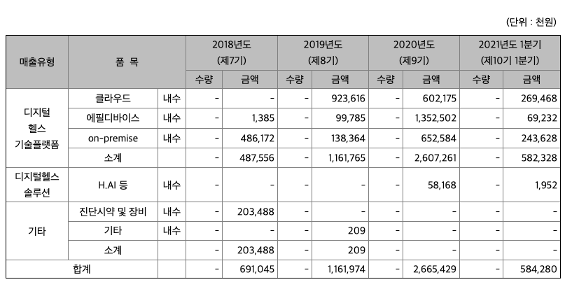 디지털헬스 기술플랫폼 사업의 수익구조는 서비스 초기 고객사의 상황 및 특정 요구에 대응하기 위하여 제공하는 컨설팅 및 커스터마이징 서비스 관련 매출과 실제 서비스 제공에 따라 계약기간 동안 지속적으로 발생하는 라이프레코드 사용료(플랫폼 사용료, 월간 정액), API 사용료(호출 1회당), 운영수수료(실비기준, 연간 정액(월 정산 방식))의 서비스 사용료가 있습니다. 또한 라이프레코드와 연동하여 개인건강측정 및 관리를 가능케하는 디바이스 에필 판매수익으로 구분되며, 각 서비스별의 기본 가격 정책은 아래의 표와 같으나 실제 고객사의 상황에 맞춰 가격 변경이 가능합니다.