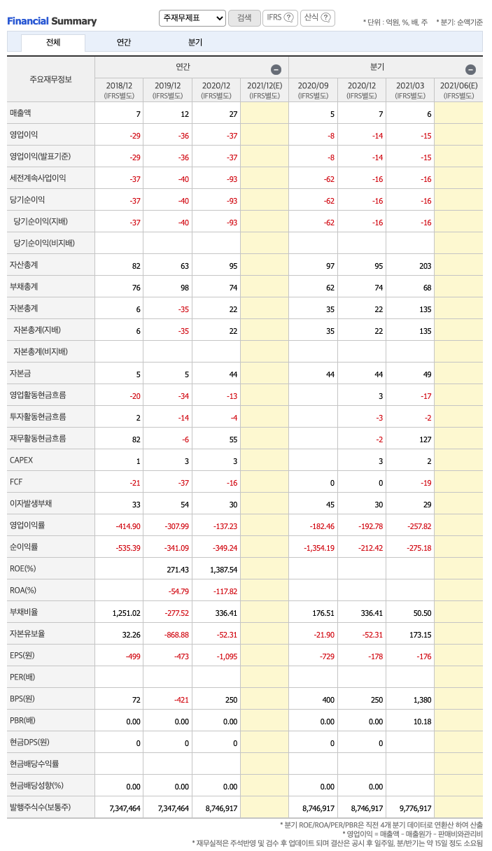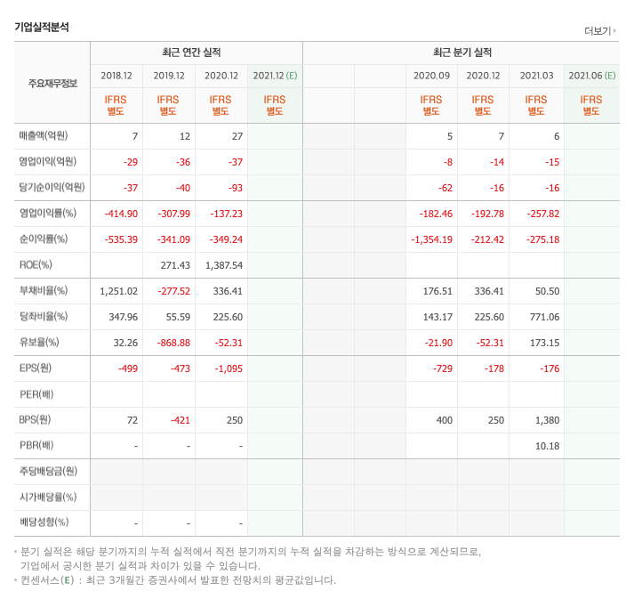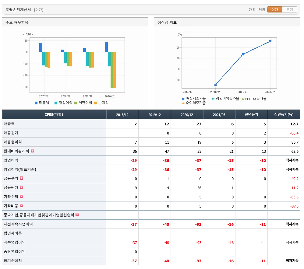 매출액 : 2018년 7억원, 2019년 12억원, 2020년 27억원으로 증가, 2021년 1분기 6억원으로 전년동기대비 증가하였습니다. 2021년 1분기는 전년동기대비 12.7% 증가하였습니다.