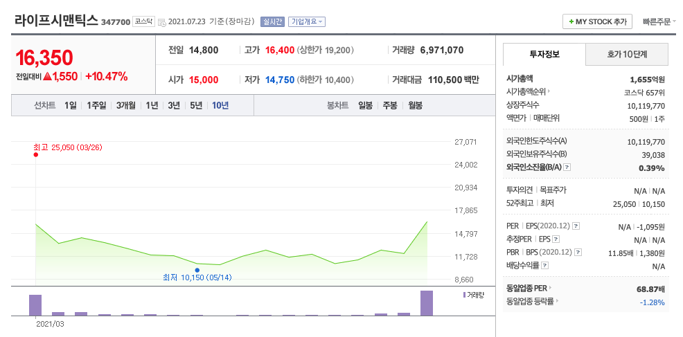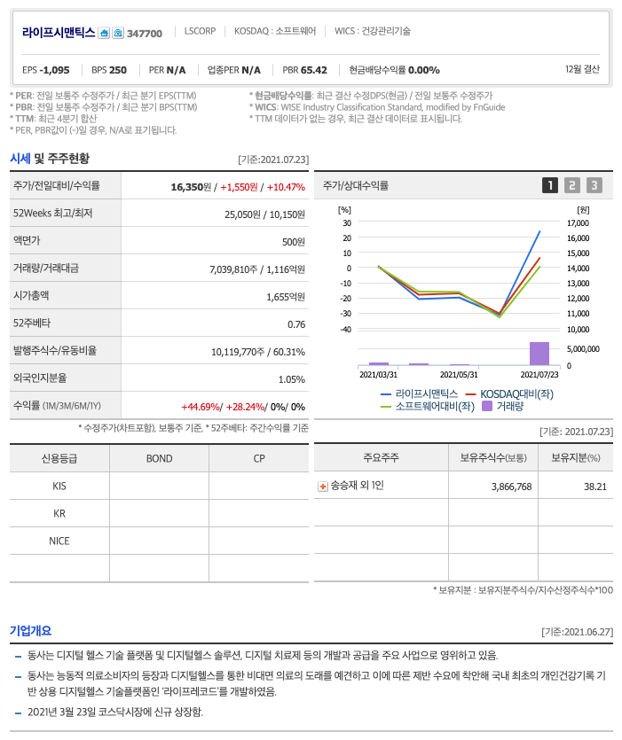 라이프시맨틱스는 상장된 이후 조정을 받았고, 21년 7월에 반등을 하였습니다.