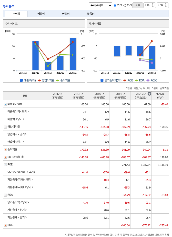 ROA(Return On Assets, 총자산순이익율, 경영자의 관점) : 2019년 약 -54%, 20202년 약 -117%이고, 총자산이익율은 이상율(10%)보다 낮습니다.