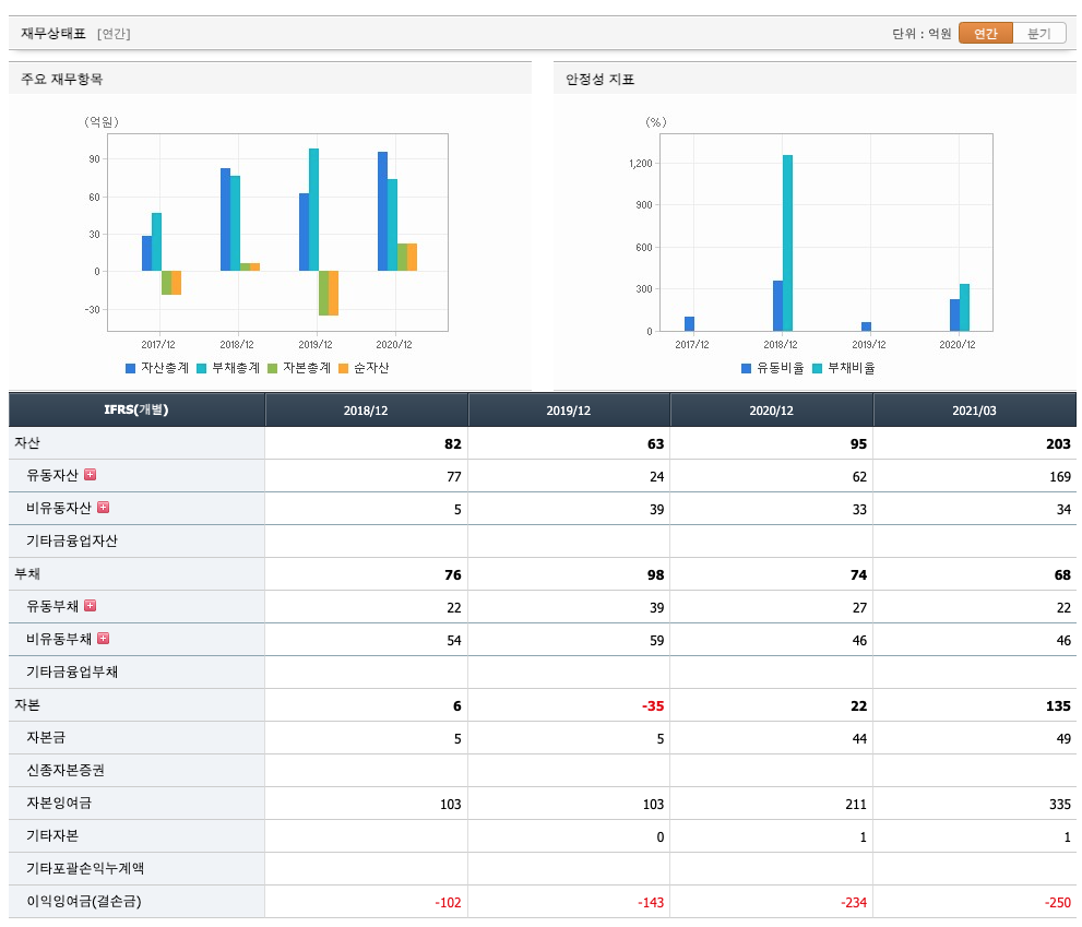 자본은 2018년 6억원, 2019년 -35억원으로 감소, 2020년 22억원, 2021년 1분기 135억원으로 증가하였습니다.